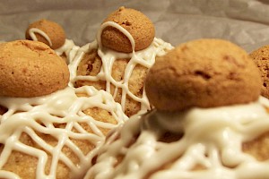 Jeweils einen Amarettinikeks pro Muffin mit etwas Kuvertüre befestigen.